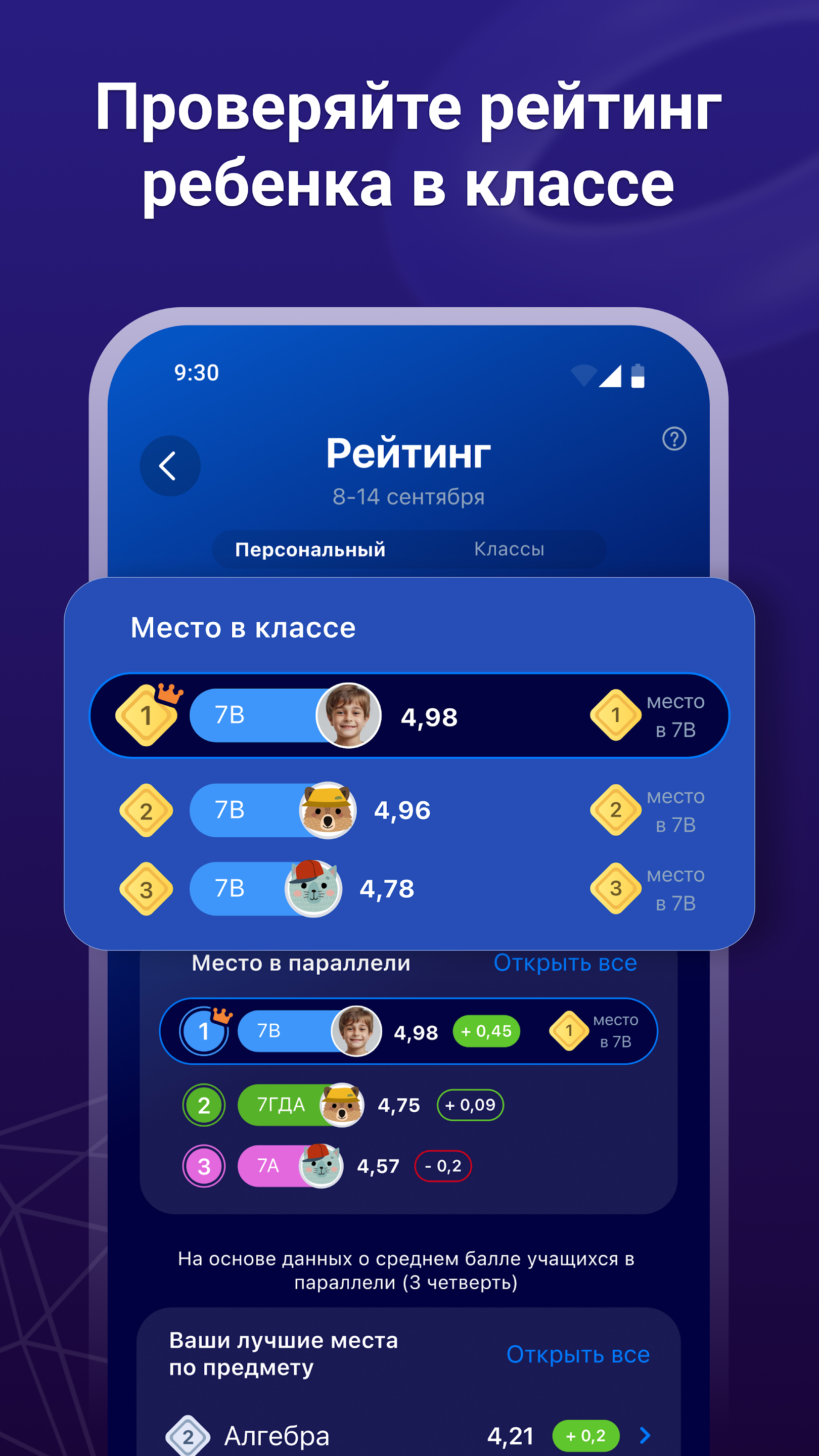 Приложение удобно систематизирует все оценки, позволяя видеть полную картину академических достижений. Вы можете просматривать не только текущие "проходные" баллы, но и результаты самостоятельных, контрольных, а также семестровых и годовых работ. Это помогает вовремя заметить сложности в определенном предмете и оказать поддержку, не дожидаясь серьезного отставания.